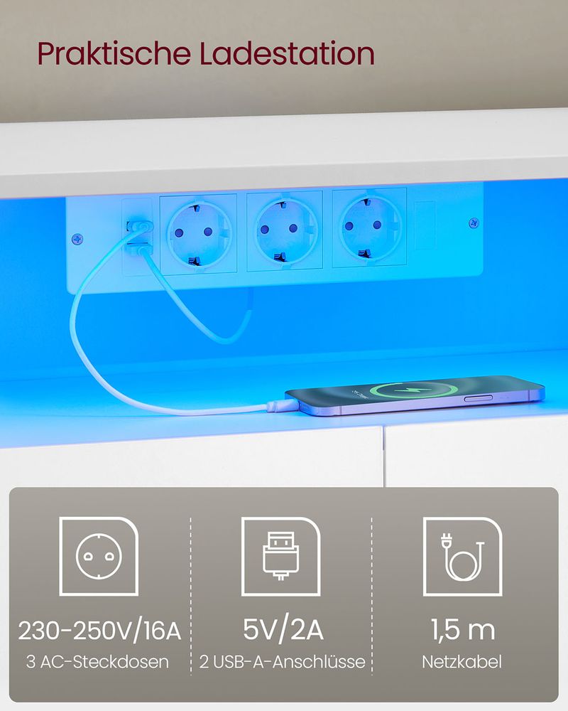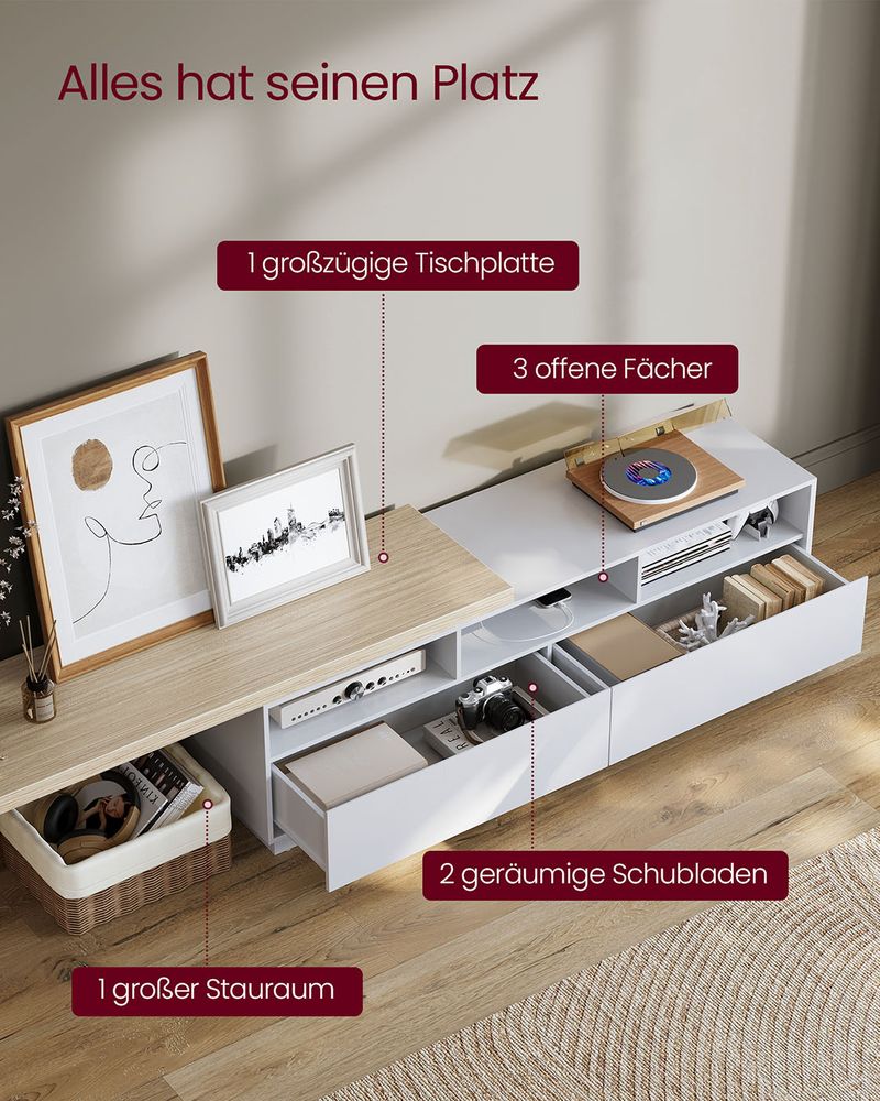 TV Meubel Uitschuifbaar – Met LED-Verlichting & Oplaadstation – Voor TV’s tot 65 inch – Verstelbare Lengte 162-270 cm – Wit/Beige