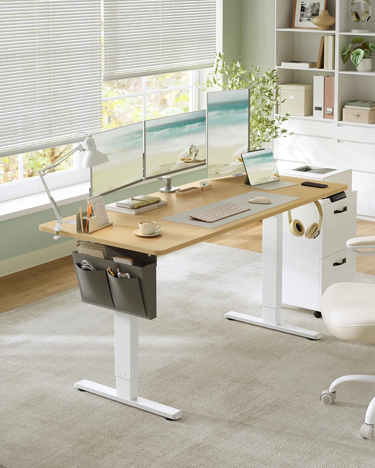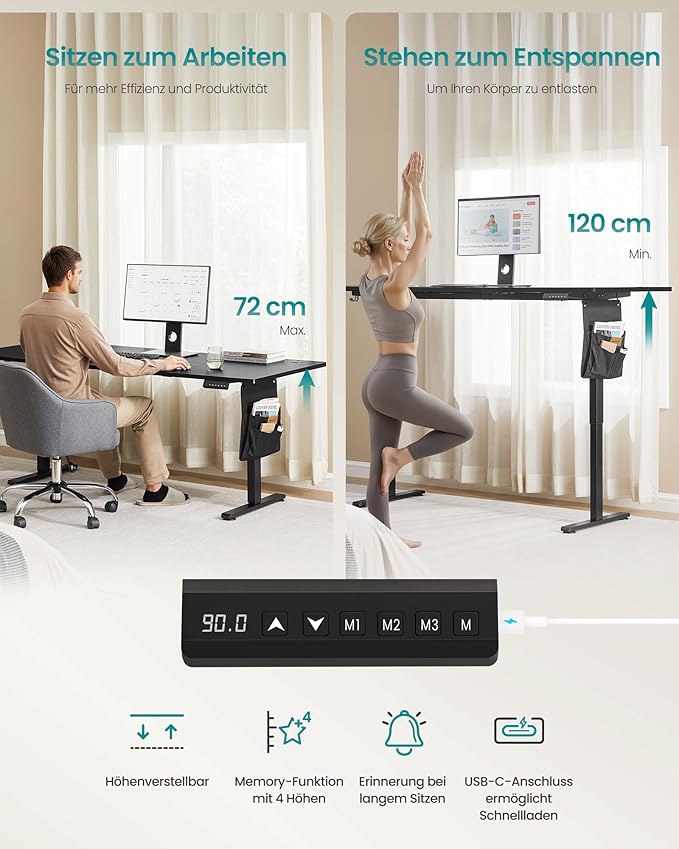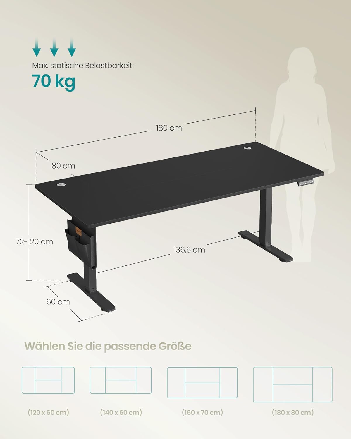 Creëer de perfecte werkplek met deze complete set bestaande uit een elektrisch verstelbaar bureau en een ergonomische bureaustoel. Het bureau is traploos verstelbaar van 72 tot 120 cm, waardoor u eenvoudig kunt afwisselen tussen zitten en staan. Met vier geheugenstanden stelt u favoriete hoogtes met één druk op de knop in.
