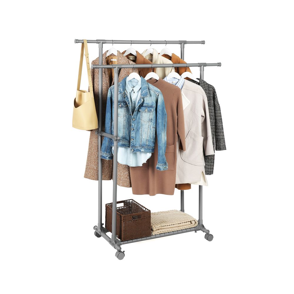 Dubbele Uittrekbare Kledingstandaard met Wielen – Verstelbare Garderobe met Schoenenrek