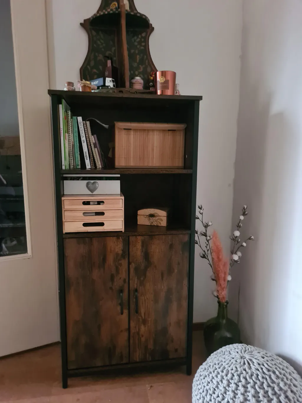 - Industrieel design: Het vintagebruine hout en het zwarte stalen frame geven deze kast een industriële uitstraling die in elk interieur past.