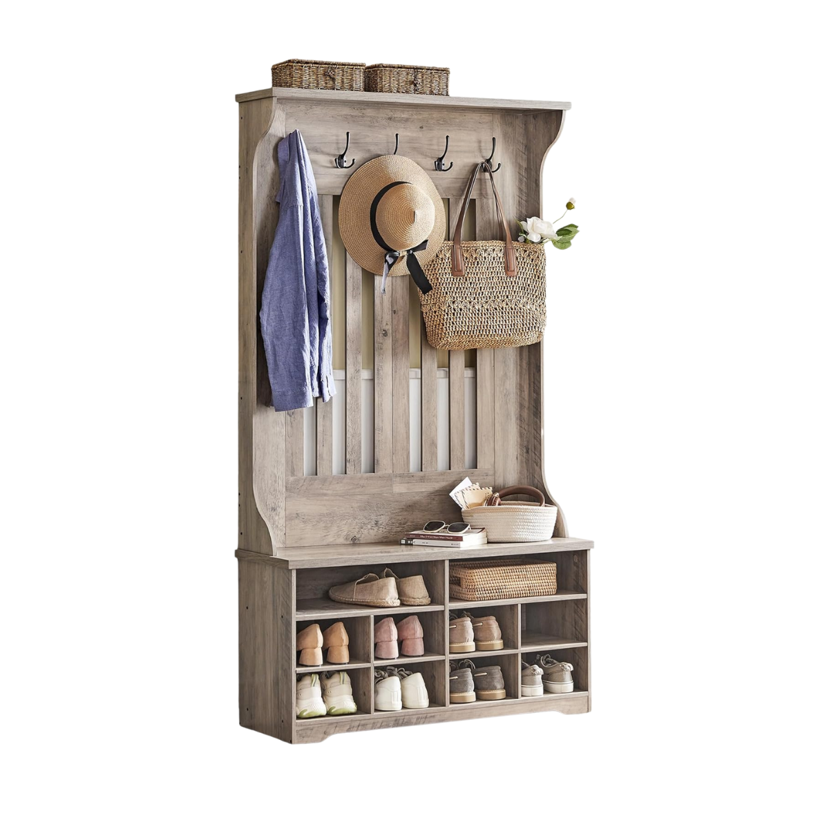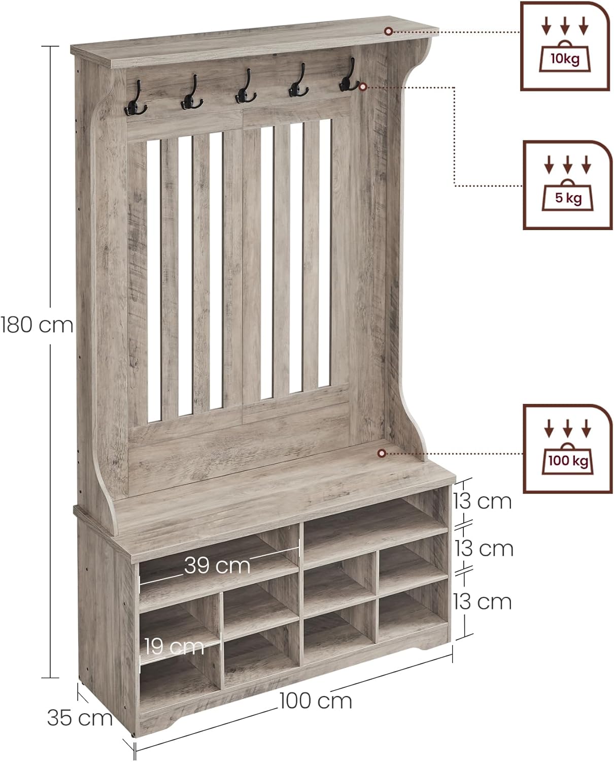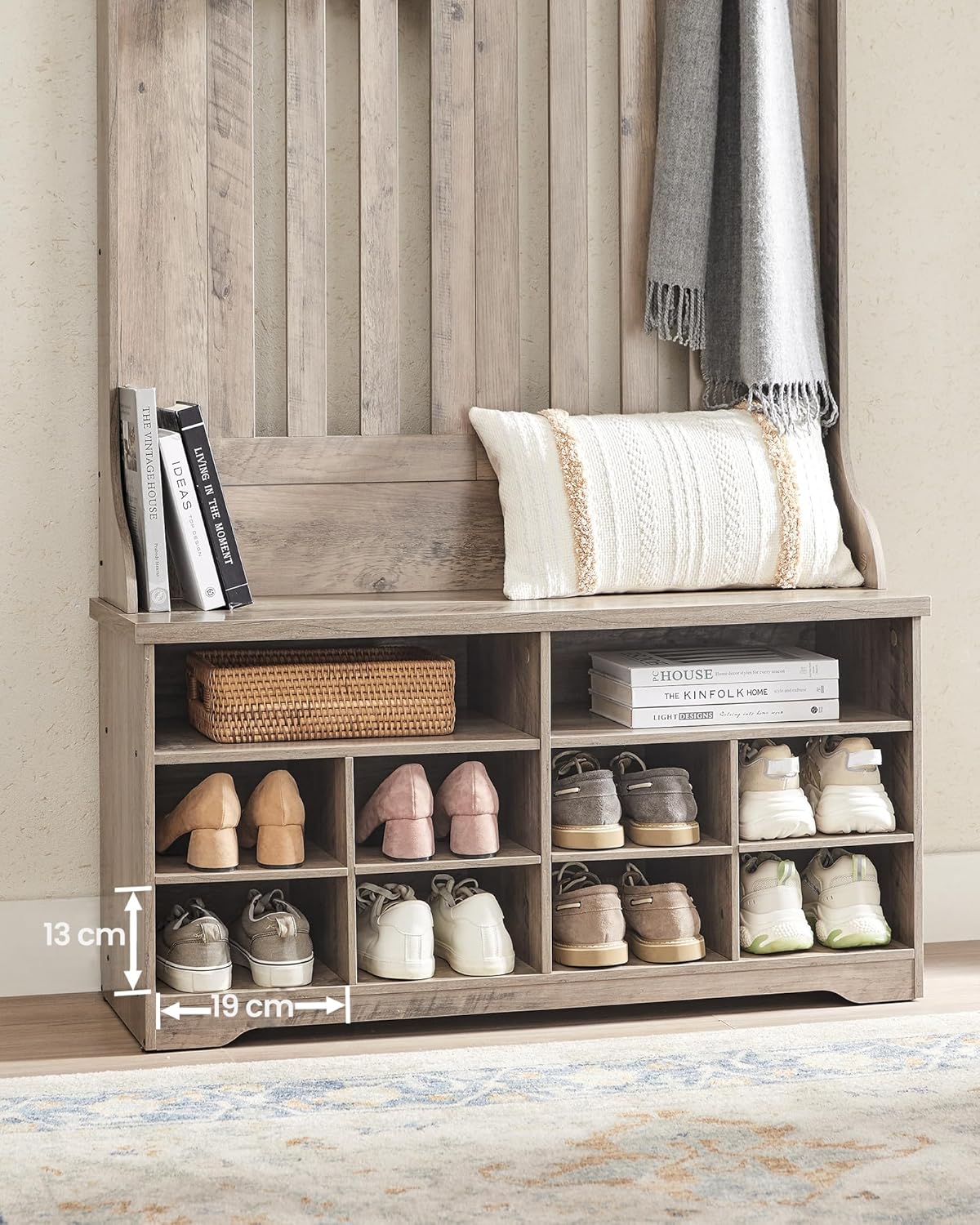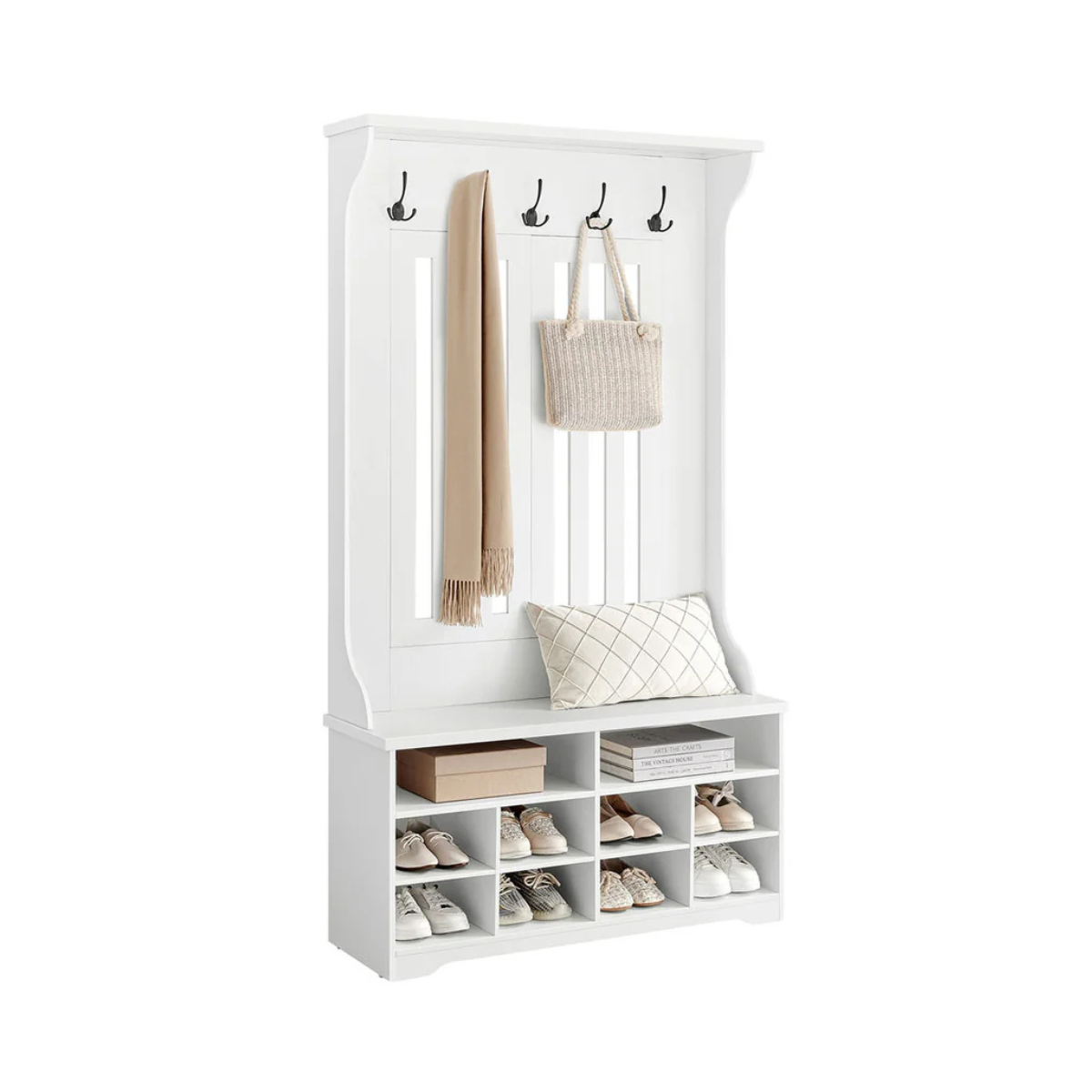 De garderobe biedt een bovenste plank voor decoratie, 5 stevige haken voor jassen, sjaals en sleutels, een bank voor tassen én 10 schoenvakken – waarvan 4 planken uitneembaar zijn voor het opbergen van laarzen of grotere schoenen.