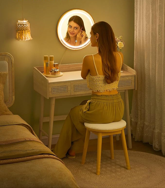 De bijgeleverde spiegel is voorzien van dimbare LED-verlichting. Kies met één druk op de knop tussen natuurlijk of warm licht om jouw beautyritueel perfect af te stemmen op het moment van de dag—van frisse ochtenden tot glamoureuze avonden.
