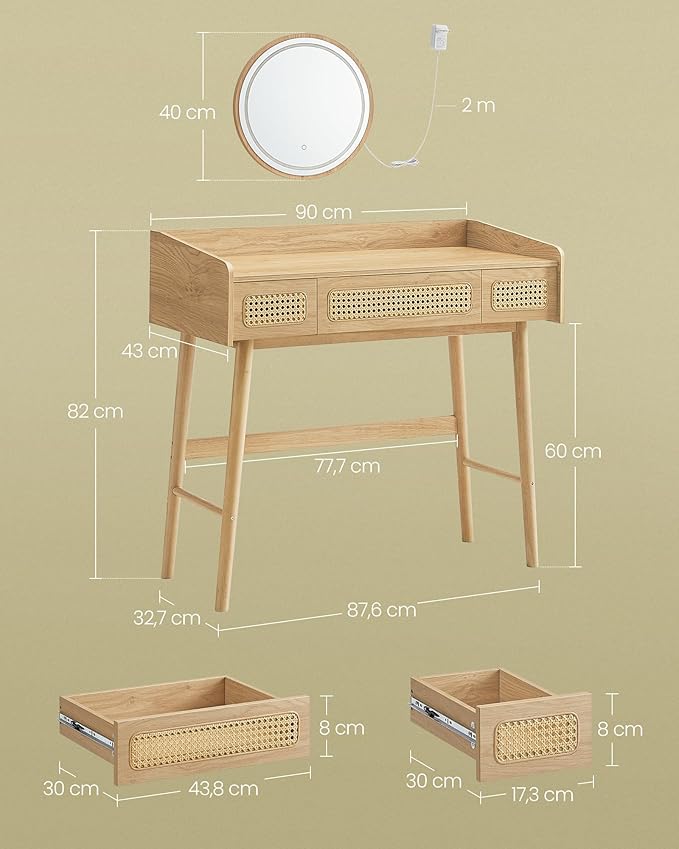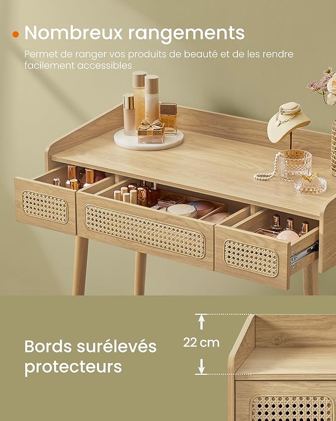 Met drie ruime lades biedt deze kaptafel voldoende plaats voor make-up, huidverzorging, sieraden en accessoires. Zo blijft je beautyruimte overzichtelijk, stijlvol en altijd gebruiksklaar.