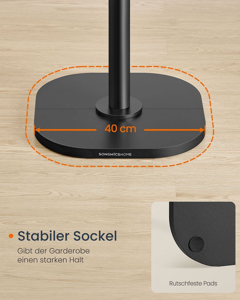 Elke haak draagt tot 5 kg, met een totale draagkracht van 40 kg. De stevige stalen structuur en brede MDF-voet (40 x 40 cm) zorgen voor uitstekende stabiliteit.
